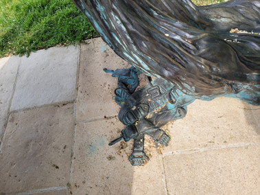 The company overall succeeded in seizing the bridge and enabled the Allies to push quickly west. Guillaume also mentioned a video produced by The History Traveler about this battle. I watched it later and it was very well done. There is a phenomenal bronze table/diorama that depicts the battle in front of the memorial statue, and when I walked around the front, I saw the table appears as if it’s draped with an airborne parachute.